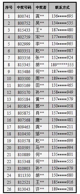 溫馨提示:表格中顯示黃色的的三位中獎(jiǎng)?wù)哒?qǐng)注意,由于您們的聯(lián)系方式填寫(xiě)有問(wèn)題,暫時(shí)無(wú)法聯(lián)系到您們,請(qǐng)您們看到通知以后,馬上與我們聯(lián)系,謝謝!